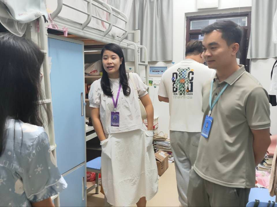 于2024年6月5日19:00,在武鸣校区松园宿舍楼组织开展走访毕业生宿舍活动。参与本次活动的有学院辅导员王立彬老师、陆胜文老师、吴希蕾老师以及学生干部代表。