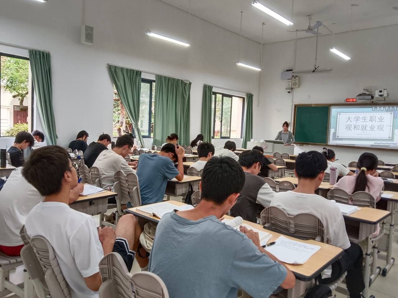 在班会上,主持人王秋媛简短介绍班会目的和重要性,强调职业观和就业观对大学生未来发展的影响。随后主持人通过播放一段关于职业发展和就业市场的短视频,引起同学们的兴趣。主持人通过解释职业观的概念,让同学们认识到职业观对于个人职业选择、职业发展和职业满意度的影响。接着主持人举例说明拥有正确职业观的人如何在职场中取得成功,并强调自我认知的重要性。此外,主持人讲述了就业观对于个人求职、职业发展和社会适应能力的影响。强调提升自身能力的重要性,这其中包括专业技能、沟通能力、团队协作能力等。她提倡要保持积极心态,鼓励学生勇敢追求自己的职业目标。