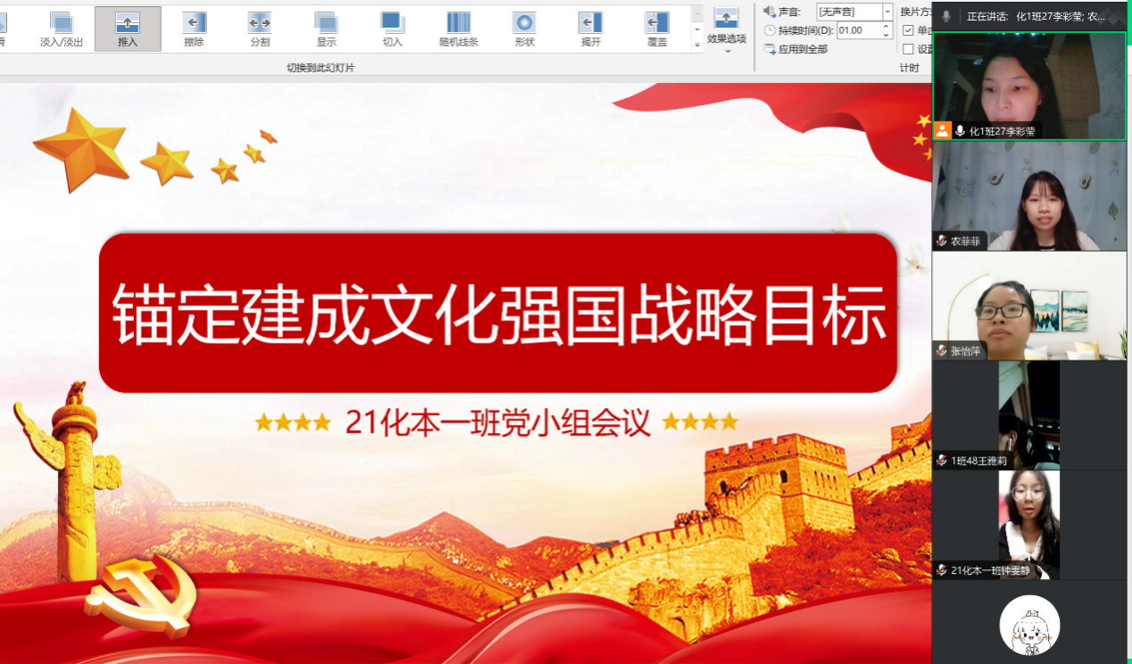 学生第一党支部21化本一班党小组采取线上方式召开专题党课学习会议,此次会议由党小组党员李彩莹同志主持,党小组全体党员参加。